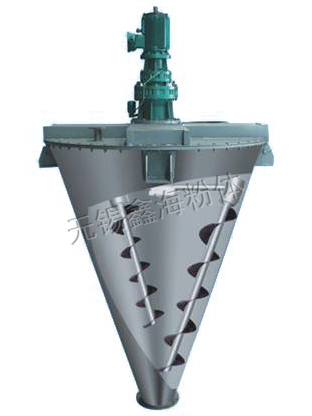 由于雙螺旋的公轉(zhuǎn)而使粉體沿著錐體壁作圓周運動。螺旋葉片的自轉(zhuǎn),使粉體向錐體中央排放作徑向運動。粉體自錐體向上升流及螺旋外圓周表面上排出,即螺旋軸方向混合。螺旋在混合機內(nèi)公轉(zhuǎn),自轉(zhuǎn)的組合,造成了粉體的四種流動形式,也就是對流,剪切,擴散,滲合的復(fù)合運動。因此粉體物料在這種混合機內(nèi)能迅速達到均勻的混合。